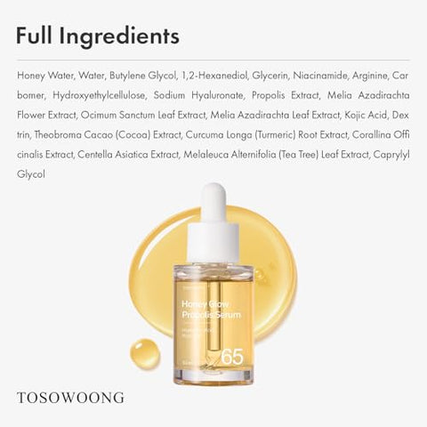 Honey Glow 65% Propolis Serum with Hyaluronic Acid, Kojic Acid & Niacinamide, Hydrating Facial Serum 33ml, 1.11 fl.oz.