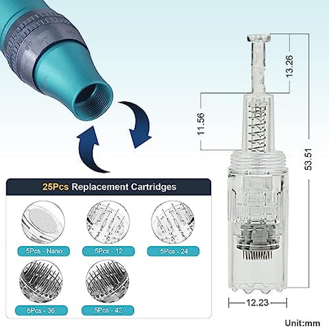 • 【25Pcs Replacement Cartridges】The Dermapen comes with 25pcs individually packaged cartridges, 5pcs of which are 12-pin and 5pcs are 24-pin, 5pcs are 36-pin, 5pcs are 42-pin, 5pcs are round nano . These cartridges are disposable and one-time use. It is very convenient to replace each time.